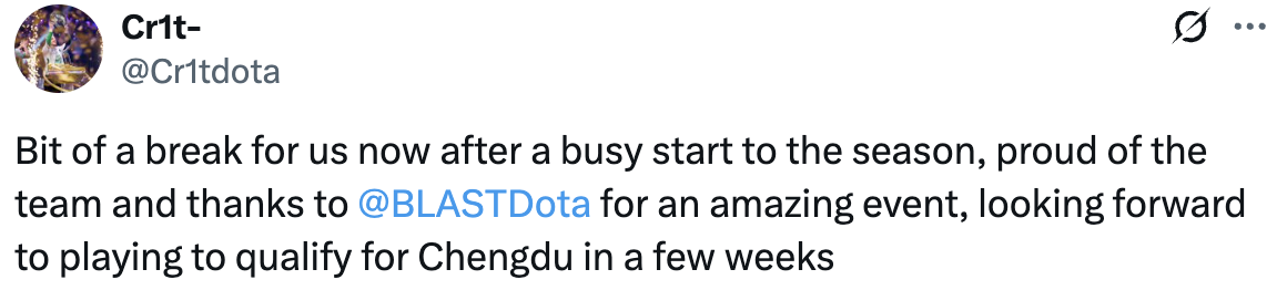Небольшая передышка после насыщенного старта сезона. Горжусь своей командой и благодарю BLAST за отличный турнир. С нетерпением жду квалификации к Чэнду через пару недель.