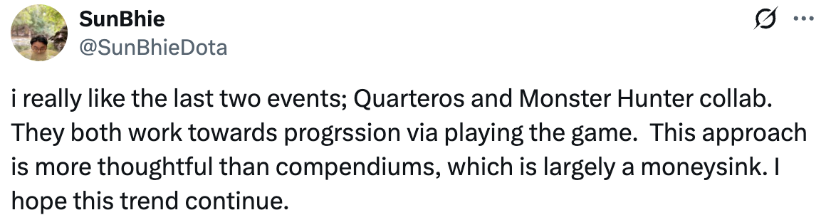 Мне действительно понравились два последних ивента – Квортеро и коллаборация с Monster Hunter. Оба поощряют прогресс через саму игру. Такой подход гораздо более продуманный, чем компендиумы, которые в основном служат просто способом потратить деньги. Надеюсь, эта тенденция продолжится.