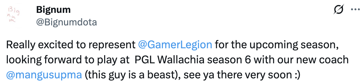 Очень рад представлять GamerLegion в новом сезоне. С нетерпением жду игр на PGL Wallachia Season 6 вместе с нашим новым тренером Mangusu (этот парень – зверь). Увидимся совсем скоро :)