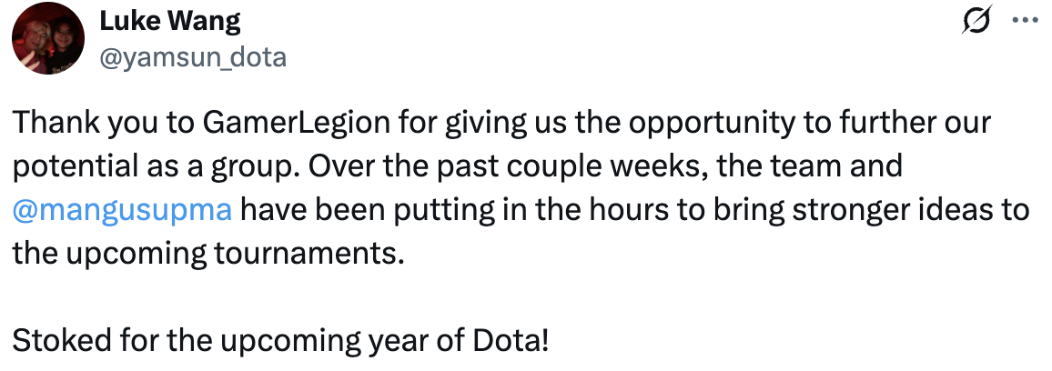 Спасибо GamerLegion за предоставленную возможность раскрыть наш командный потенциал. Последние пару недель коллектив и Mangusu усердно трудились, чтобы сформировать более сильные идеи к будущим турнирам. В предвкушении предстоящего года Доты!