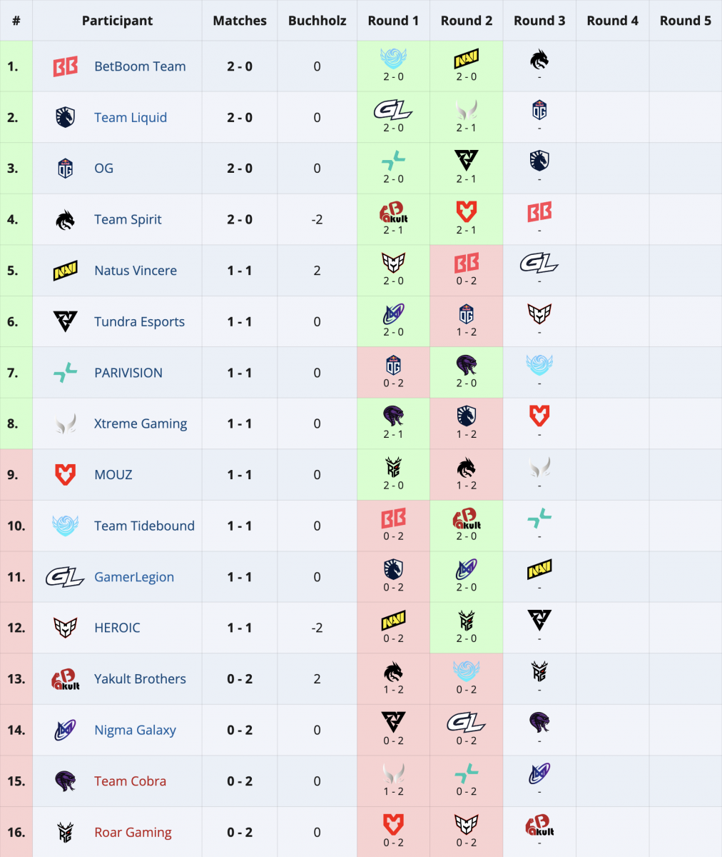 OG. Завтра участники будут поделены на три корзины по количеству побед и поражений (2:0, 1:1, 0:2). Соответственно, команды будут играть только с соперниками из своей корзины.