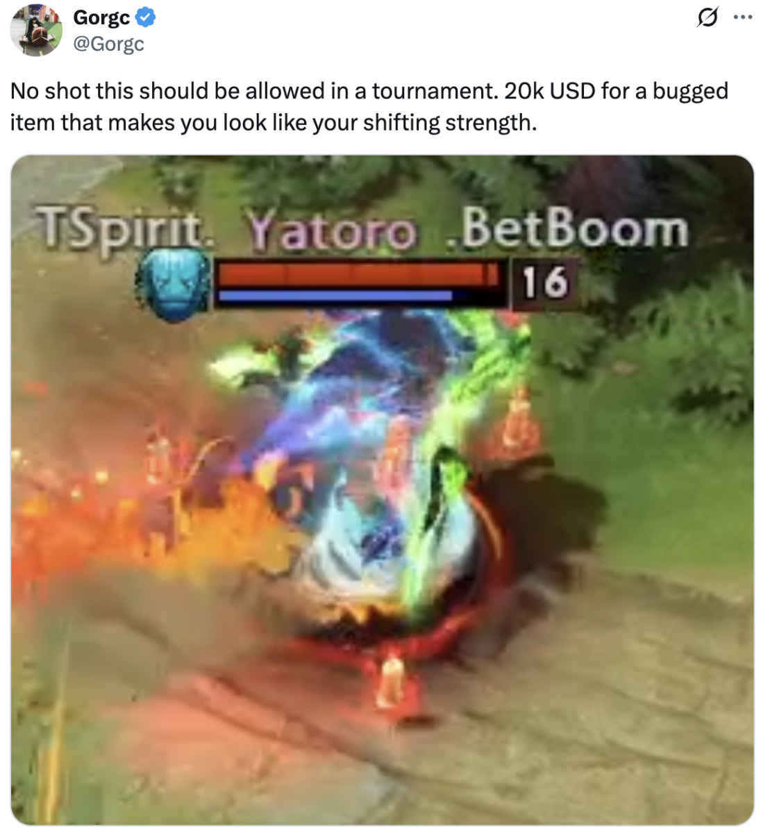 Ничего подобного не должно быть разрешено на турнире. $20 тысяч за багнутый предмет, из-за которого ваш герой [Morphling] выглядит так, будто он «перекачивается».