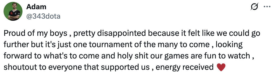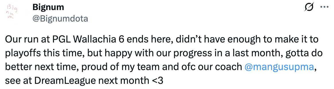 Наше выступление на PGL Wallachia Season 6 на этом заканчивается – в этот раз нам не хватило сил, чтобы выйти в плей-офф. Но мы довольны прогрессом за последний месяц. В следующий раз нужно выступить лучше. Горжусь своей командой и, конечно же, нашим тренером Mangusu. Увидимся на DreamLeague в следующем месяце <3