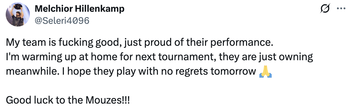 Моя команда чертовски хороша, я горжусь их игрой. Я готовлюсь дома к следующему турниру, а они тем временем просто всех уничтожают. Надеюсь, завтра они покажут всё, на что способны. Удачи, MOUZ!!!