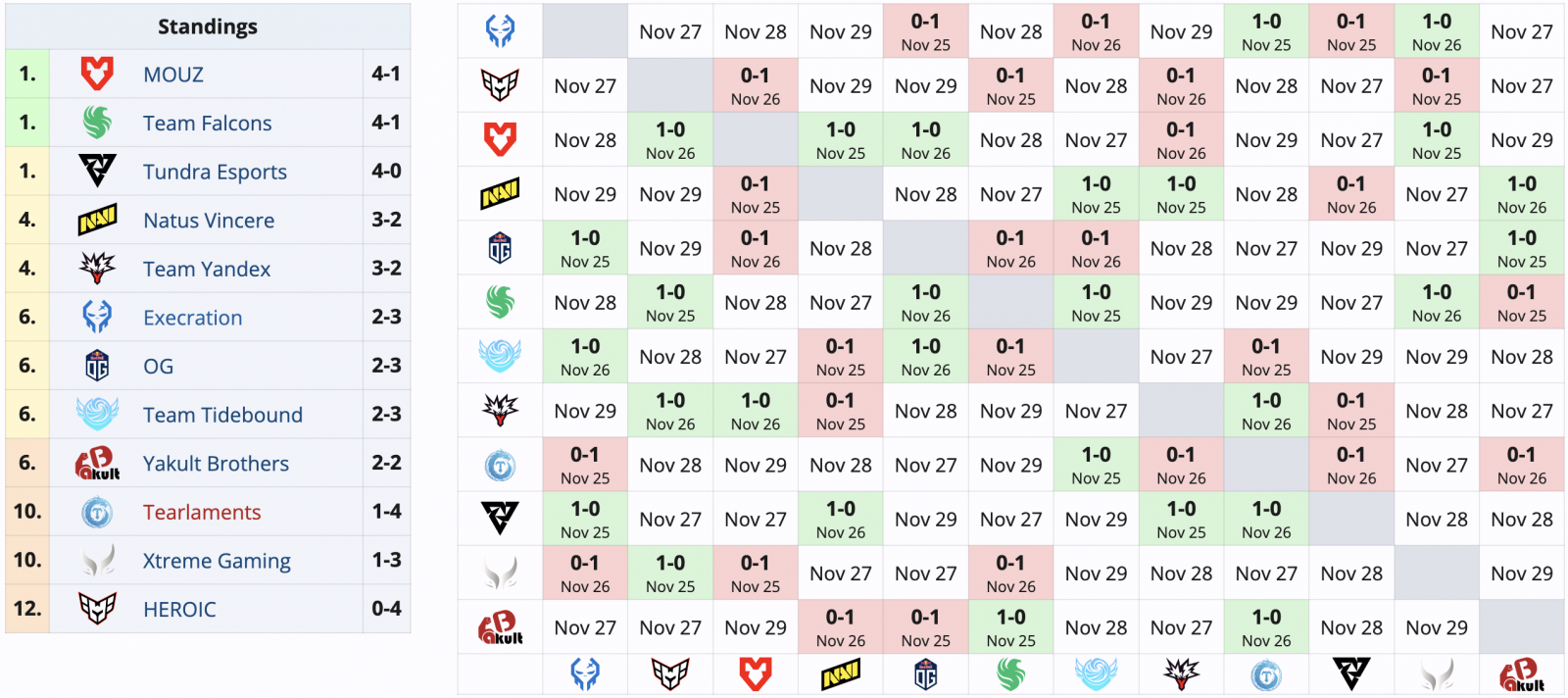 Tundra Esports набрали по четыре победы в турнирной таблице. Еще две команды –