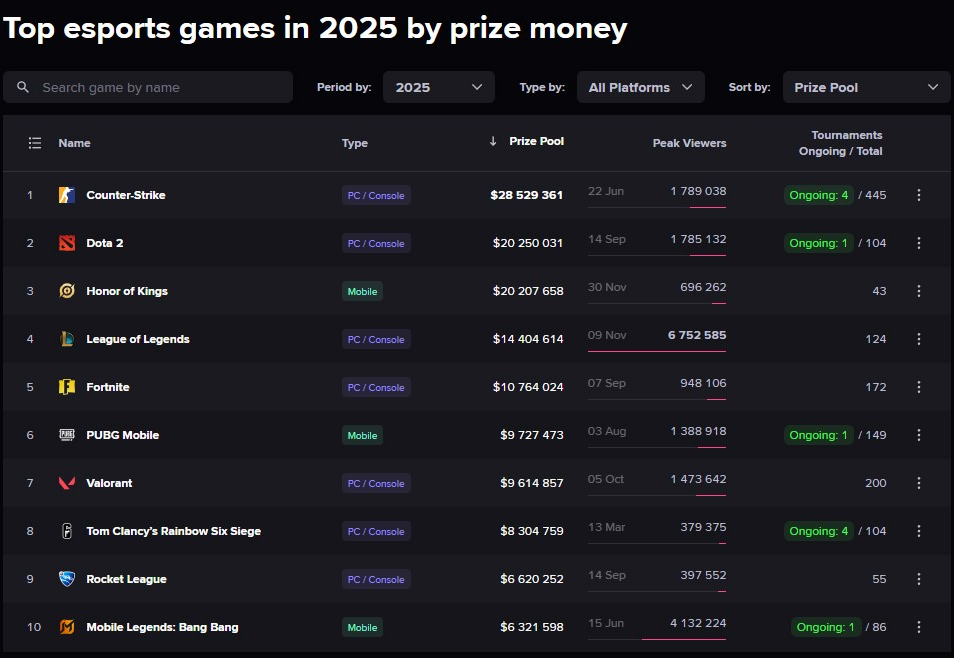 Dota 2 заняла второе место среди всех киберспортивных дисциплин по суммарному количеству призовых, разыгранных на чемпионатах в 2025 году. Статистикой поделился аналитический портал Esports Charts.