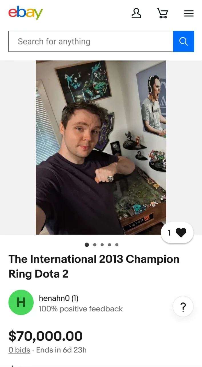 Стартовая стоимость кольца составляет $70 тысяч. При этом перстень можно выкупить за $90 тысяч, не дожидаясь окончания аукциона. Сам шведский кибрспортсмен так пояснил свое решение: