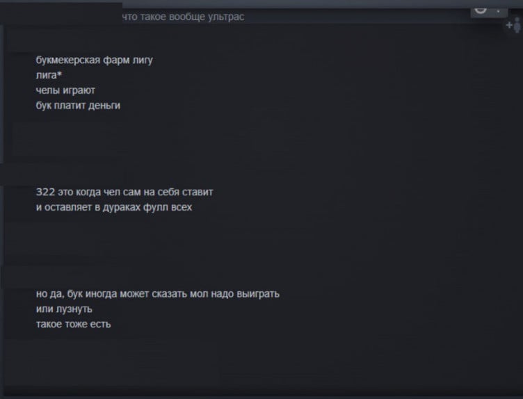 сейчас буду поднимать неприятную тему для нас, но лучше я это сделаю, чем молодые игроки попадут в эту ловушку и испортят свое будущее. я всегда открыта помочь молодым пацанам, особенно если они планируют прийти в киберспорт, парни спокойно могут спросить меня за ростер, игроков, турниры и все что я буду знать на тот момент (как минимум смогу предостеречь). в течении недели ко мне обратилось пару крутых малых по турниру Ультрас (Ultras Dota Pro League) куда ребят приглашали играть, но не просто, а для бука и турнира. с малыми поговорили, благо они молодцы и поняли, что это за люди и что им это не нужно. долго думала, что делать с данной информацией - можно было попросить малых вступить туда и узнать информацию, можно собрать список игроков, которые там играют - 50 сезонов!, но столько сил было положено на работу с 322 турнирами, которые не дали результата, попыткой привлечь к ответственности, а так же вовлеченность ответственных ТО к данному вопросу, которые стопили расследование, чтобы вокруг их имени не было вопросов, нечестные игроки, которые до сих пор спокойно могут играть в соревновательную доту и спокойно на стримах рассуждают вопросы о 322 и переворачивают реальность, как им удобно, чтобы вернуться. был момент, где мы за руку с Эдом zverHDD (спасибо за работу) приводили и свидетелей и организаторов и участников к ТО, но это не дало результат, поэтому я не буду просить малых вступить в эту грязь, чтобы раскрыть типов и найти бетонные доказательства. просто предупреждаю - для себя я составлю список игроков оттуда, кто-то играл с мейнов, кто-то со смурфов ( имеем возможность узнать кто) , кто-то у меня в общих друзьях с тем кто хантит малых (да я вас тоже сохраню и дам информацию по вам) и постараюсь в дальнейшем не пересекаться в работе. так что думайте 100гривен вин, 50 гривен луз и 100 гривен за колл на луз стоят вашего будущего