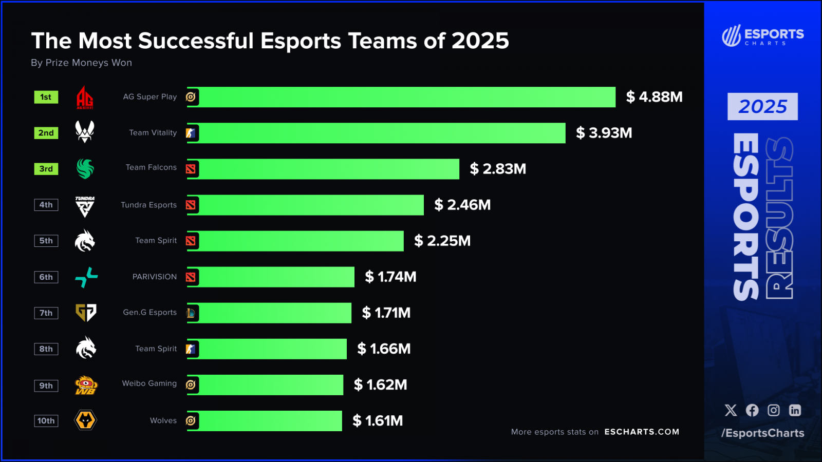 Аналитический портал Esports Charts составил рейтинг самых успешных киберспортивных команд 2025 года по количеству заработанных призовых.