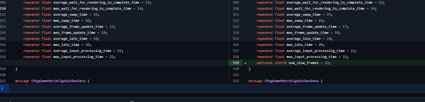 В протобафф сообщение CMsgGameMatchSignOutPerfData добавлена строка optional uint32 num_slow_frames = 23 для отслеживания проблем с производительностью на сервере по окончанию матча. Собирают статистику, чтобы мы потом не кричали, что а****ь как лагает всё.