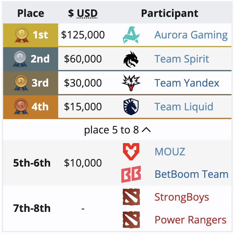 За победу Aurora Gaming получила 125 тысяч долларов США. Серебряному призеру досталось $60 тыс.