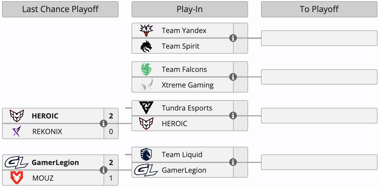 В стадии Last Chance Playoff Весь мир, World HEROIC одержала победу над Индонезия, Indonesia REKONIX, а США, United States, US GamerLegion оказалась сильнее Весь мир, World MOUZ. Победители прошли в Play-In, а проигравшие разделили 11-12 место и заработали по $10 тысяч призовых.