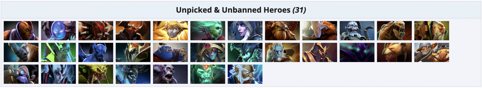 31 персонаж был полностью проигнорирован участниками BLAST Slam VI по Dota 2 по итогам чемпионата. Полный список героев, которых ни разу не пикнули и не забанили на турнире, выглядит следующим образом: