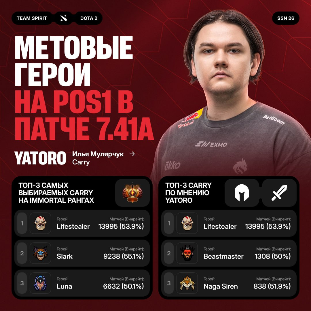 Илья «Yatoro» Мулярчук перечислил сильнейших персонажей на первую позицию в актуальном патче 7.41a в Dota 2.