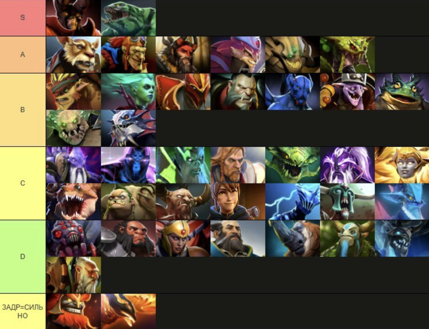 В самую высокую категорию Козловский поместил всего двух персонажей – Doom Doom и Tidehunter Tidehunter. Следом за ними расположились Beastmaster Beastmaster, Brewmaster Brewmaster, Pangolier Pangolier, Sand King Sang King и др.