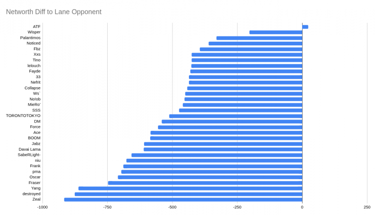 Среди оффлейнеров явно выделяется Иордания ATF – он единственный игрок третьей позиции, у которого положительная разница в нетворсе. Он также входит в четверку лучших по разнице уровня героя.