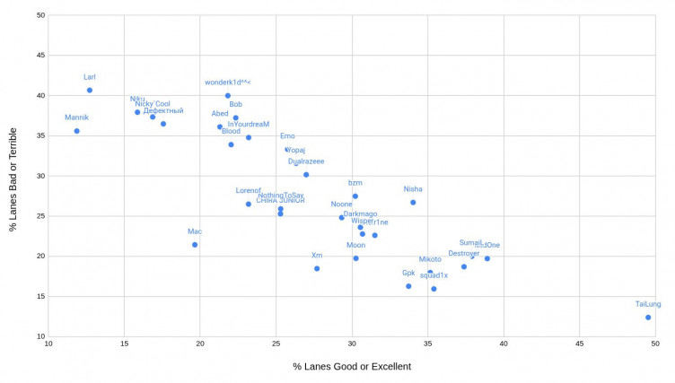 Это также отражается на успехе на линии. По пятибалльной шкале (отлично/хорошо/ничья/плохо/ужасно), основанной исключительно на нетворсе в первые 10 минут, он попадает в категории «отлично» или «победа» в 49.5% случаев, а в категории «плохо» и «ужасно» – всего 12.4% времени.