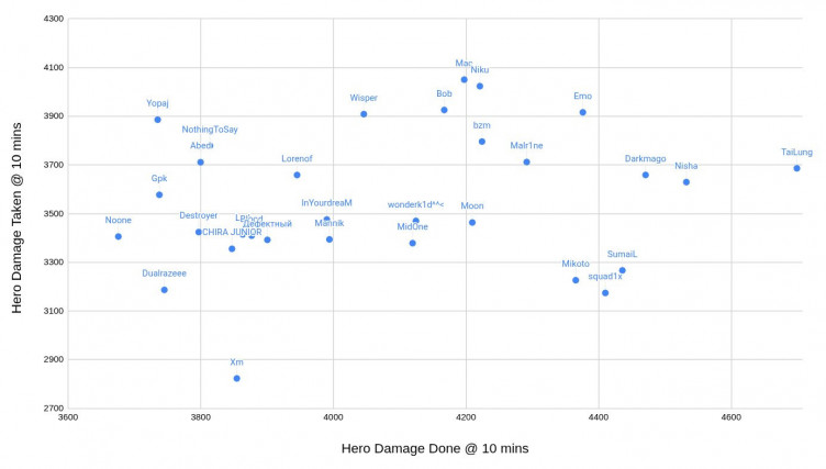 Еще одна метрика для анализа – средняя разница на линии против соперника в первые 10 минут.