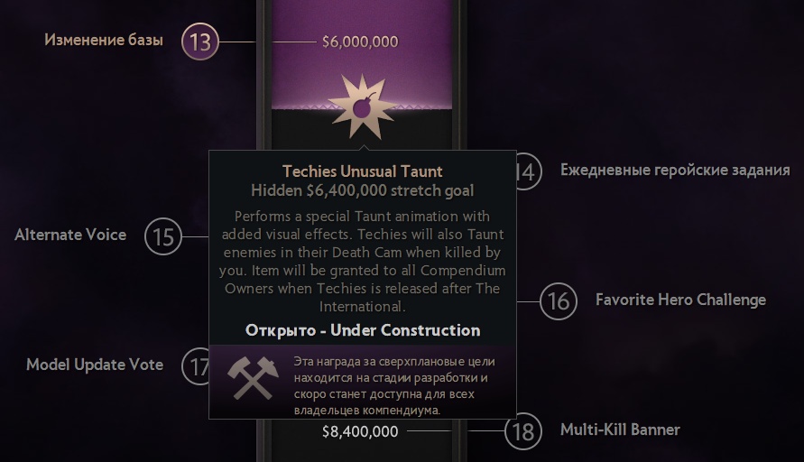 Для всех владельцев компендиума открыта насмешка на минера, которой он будет дразнить тех, кого он убил. Предмет будет доступен когда минер выйдет, а это примерно после окончания TI4.