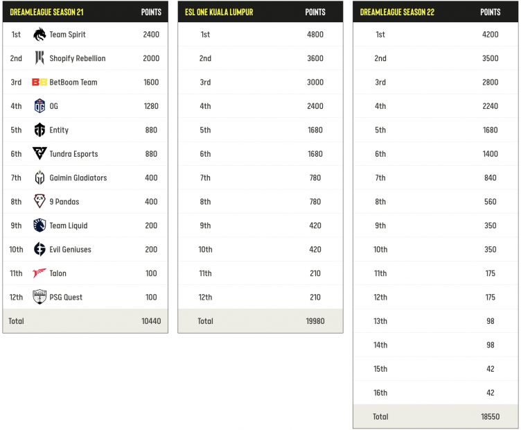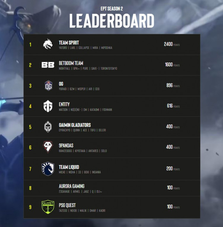 Team Spirit занимает в рейтинге первое место, имея 2400 очков в своем активе. В первую тройку также входят