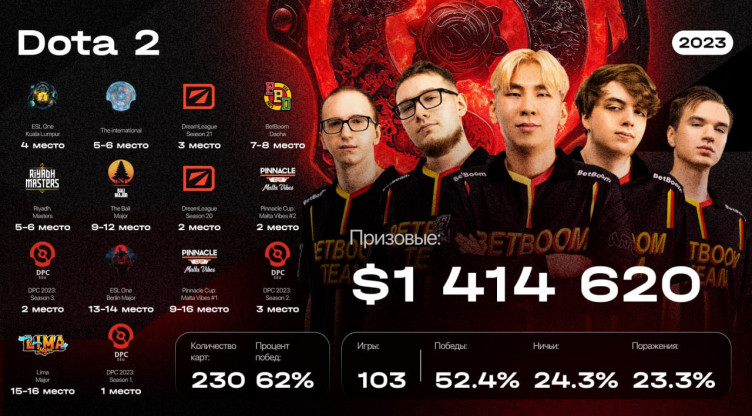 Наш состав по Dota 2 провел очень насыщенный год — команда заработала более $1.4 миллиона, что говорит само за себя. А 2024, в связи с отменой DPC-сезона, будет еще интереснее!