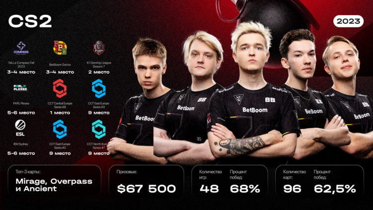 Также в этом году у нас появился состав по Counter-Strike, который сразу заявил о себе на квалификациях к IEM Sydney, а затем и на самом турнире, заняв по итогу 5-6 место. Стоит отметить и волевое выступление на BetBoom Dacha.