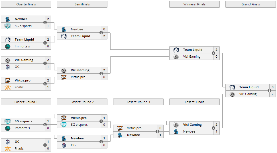 Vici Gaming и одержал волевую победу со счетом 3:2. Первые две карты в серии best-of-5 выиграли представители Китая, но затем, действующие чемпионы The International, собрались и показали чрезвычайно сильную и уверенную игру. Три последние карты гранд-финала завершились чуть более, чем один час в пользу Liquid.