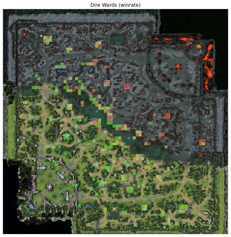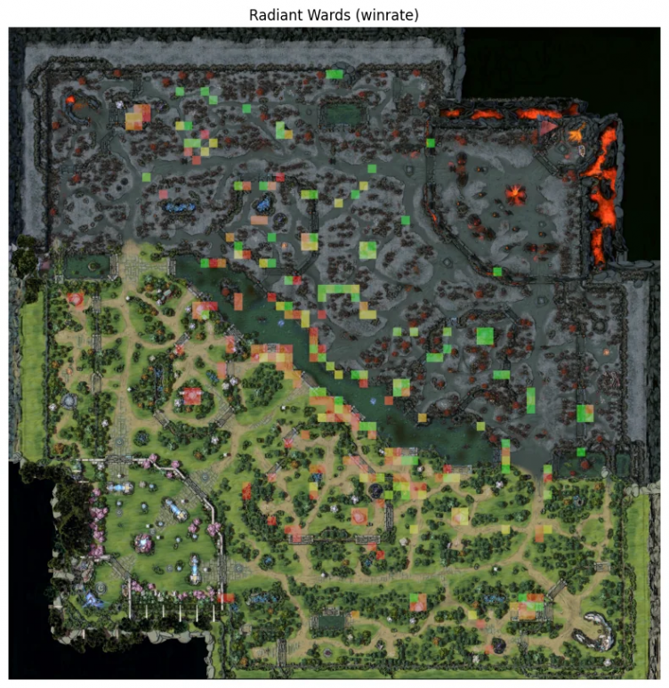 Pintoscope составил две карты, на которых отобразил расположение вардов за стороны Radiant & Dire. Места вардинга, которые чаще использовались командами в победных матчах, он выделил зеленым цветом; варды, при которых команды чаще проигрывали, обозначены красным цветом. В статистике учитывались 426 официальных игры.