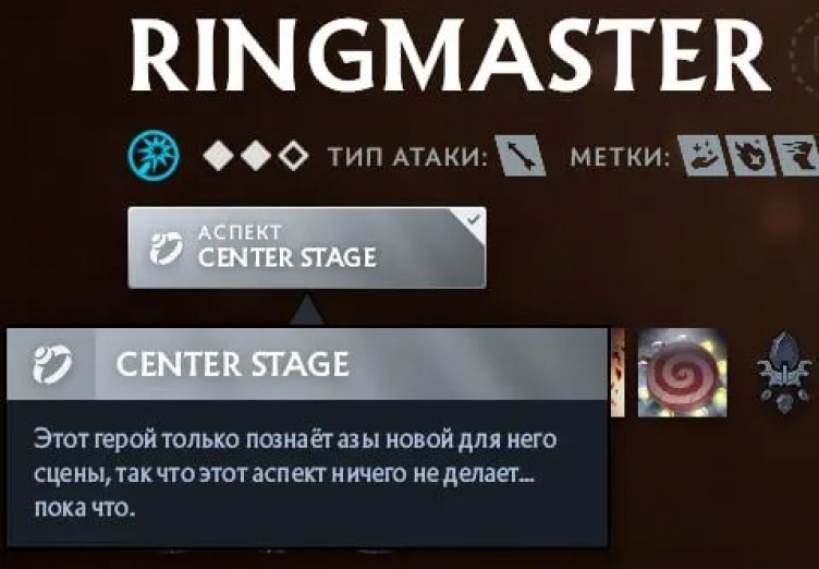 В самом клиенте игры у Ringmaster имеется аспект под названием Center Stage, который гласит: «Этот персонаж пока только познает азы новой для него сцены, так что этот аспект ничего не делает… пока что». При этом у героя есть бонус от Aghanim's Shard и врожденная способность.