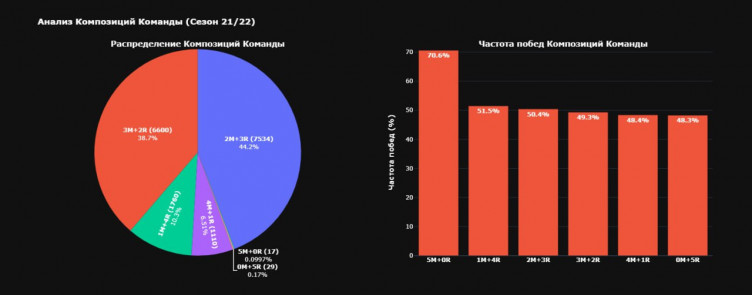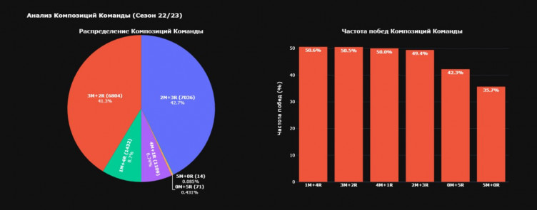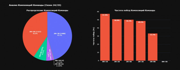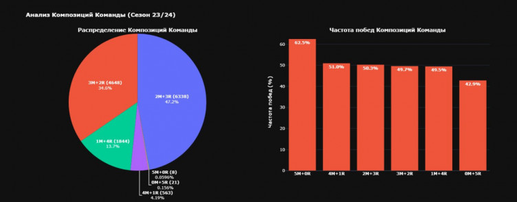 Выяснилось, что в 2024 году чаще всего побеждали связки из четырех героев ближнего боя и одного персонажа дальнего боя (57.1%). При этом чаще всего команды использовали драфт с двумя героями ближнего боя и тремя героями дальнего (45.5%).