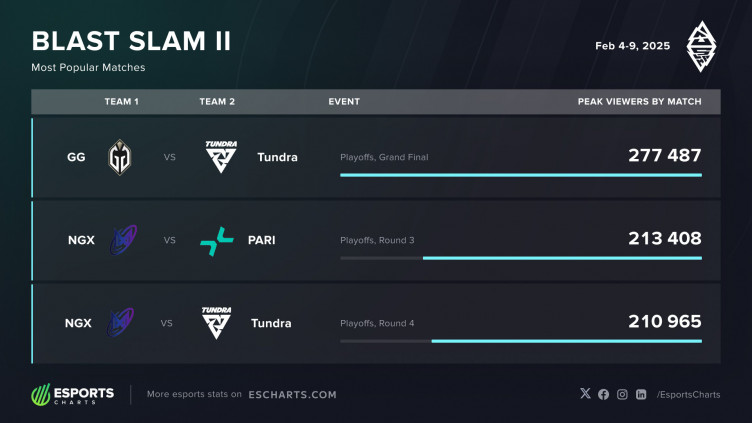В среднем каждый игровой день BLAST Slam II смотрели 128 тысяч зрителей; турнир провел в эфире 42 часа и набрал 5.4 млн часов просмотра. Статистику предоставил аналитический портал Esports Charts.
