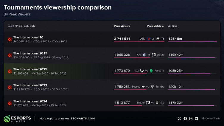 The International 2025 собрал больше 1.7 млн зрителей в пике — это 3-й результат в истории TI