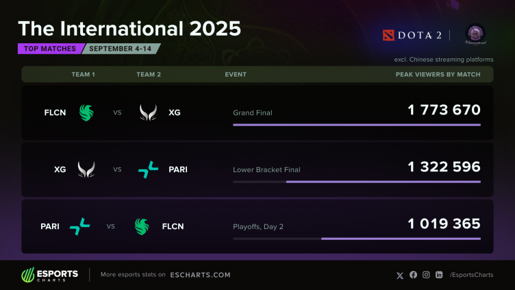Xtreme Gaming в гранд-финале стал самым популярным матчем The International 2025 – его смотрели 1.773 млн зрителей в пике. Это третий показатель в истории чемпионатов серии TI (больше было только на The International 2021 (2.74 млн зрителей) и The International 2019 (1.96 млн зрителей)).