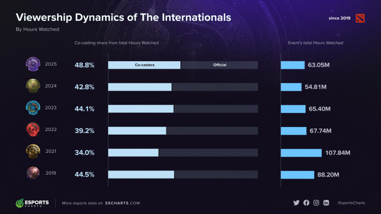 По данным аналитического портала Esports Charts, на трансляции от комьюнити-стримеров пришлось 48.8% от общего времени просмотра главного чемпионата 2025 года по Dota 2 – это самый высокий показатель в истории The International.