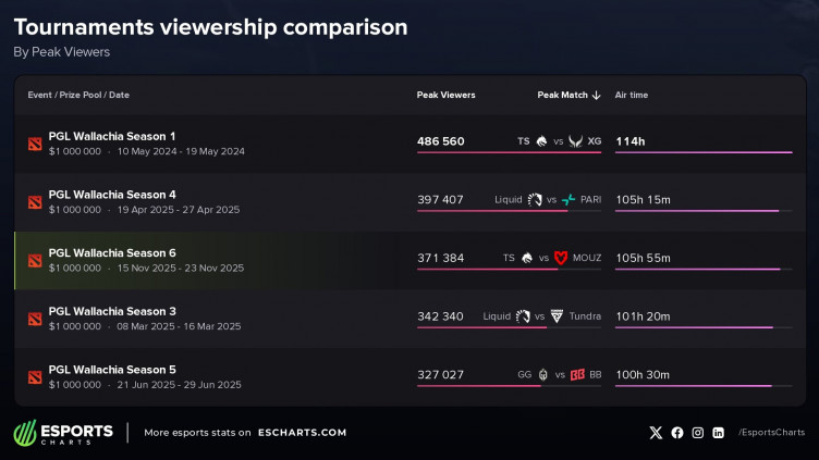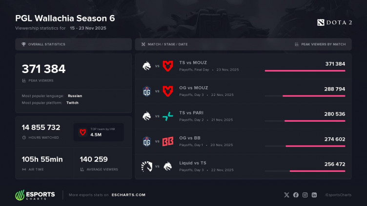 PGL Wallachia Season 6 по Dota 2 стал третьим самым популярным турниром серии по пиковому количеству зрителей, уступив по этому показателю первому и четвертому сезонам.