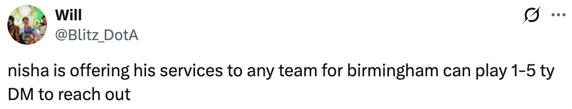Nisha предлагает свои услуги любой команде на ESL One Birmingham 2026. Он может сыграть на любой позиции.