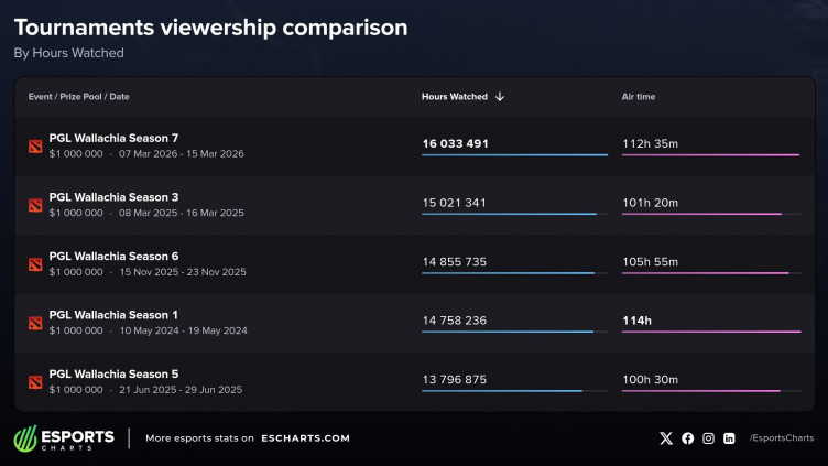 PGL Wallachia Season 7 по Dota 2 стал самым популярным турниром серии по количеству часов просмотра, но при этом показал самый низкий пиковый онлайн среди всех ивентов PGL Wallachia.