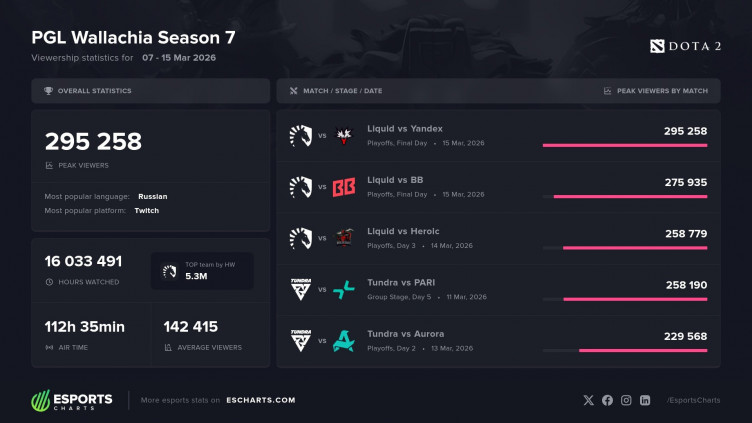 В среднем каждый игровой день PGL Wallachia Season 7 смотрели 142 тысячи зрителей; турнир провел в эфире 112 часов и набрал 16 млн часов просмотра. Статистику предоставил аналитический портал Esports Charts.