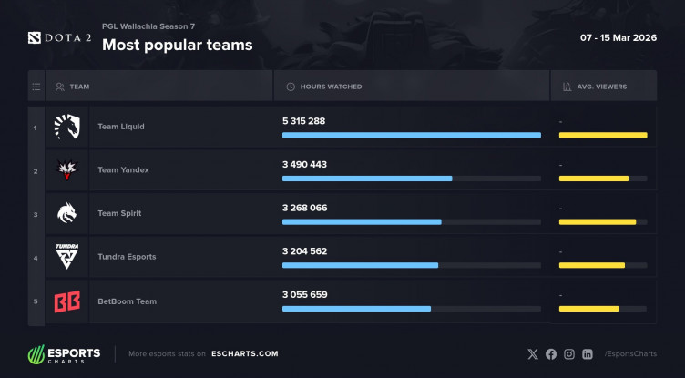 Team Liquid в гранд-финале стал самым популярным матчем PGL Wallachia Season 7 – его смотрели 295 тысяч зрителей в пике. В первую пятерку по этому показателю также вошли встречи с участием