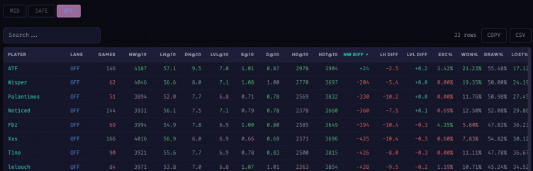 Среди оффлейнеров явно выделяется Иордания ATF – он единственный игрок третьей позиции, у которого положительная разница в нетворсе. Он также входит в четверку лучших по разнице уровня героя.