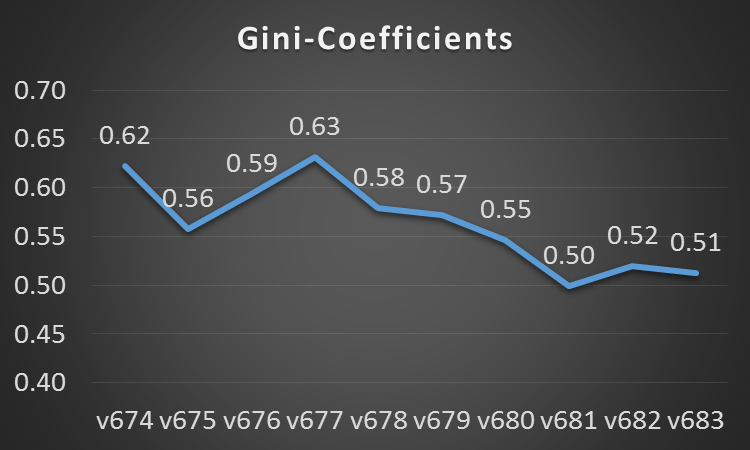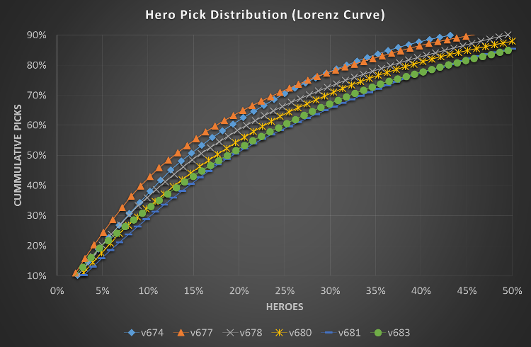 Для этого я рассчитал коэффициент Джини распредения пиков (для заинтересованного читателя: мы берем все пики одного патча, расставляем их по возрастанию относительной частоты пиков, организовываем график кумулятивной частоты пиков и сравниваем зону между теоретическим графиком равного распределения и настоящего распределения с зоной ниже графика реального распределения. В итоге мы получаем число около 0, если герои пикаются с одинаковой частотой, и почти 1, если одни и те же герои пикаются повторно.