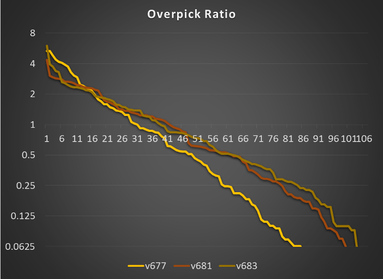 И в этом большая разница между 6.81 и 6.83: в более раннем патче было всего лишь 2 героя, перепикнутых более, чем в три раза: Мирана (4.4), Рубик (3.0), в последнем их аж 5: Венга (6.0), Скаймаг (3.9), Лион (3.7), Джаггернаут (3.4), Акс (3.3). В то же время в 6.81 было 16 героев перепикнутых от 2 до 3 раза, но только 11 таких персонажей в нынешнем патче. Хотя 6.83 не хватает вариативности в пяти топовых пиках (все пикнуты более, чем в 30% игр), пики с 6 до 19 появляются в от 2% до 4% игр, чем эквивалентные герои версии 6.81. И это лишь с пятью дополнительными героями в мете.