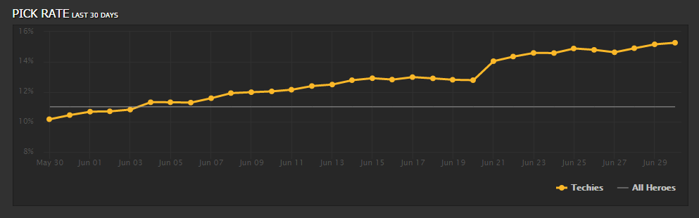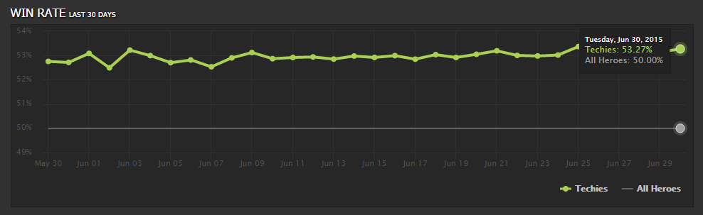 Винрейт вообще заслуживает отдельного упоминания - 53.27%. По этому показателю Techies находится на 21 месте среди всех героев в Dota 2. Довольно неплохо для героя, который еще несколько месяцев назад находился на последних местах этого списка.