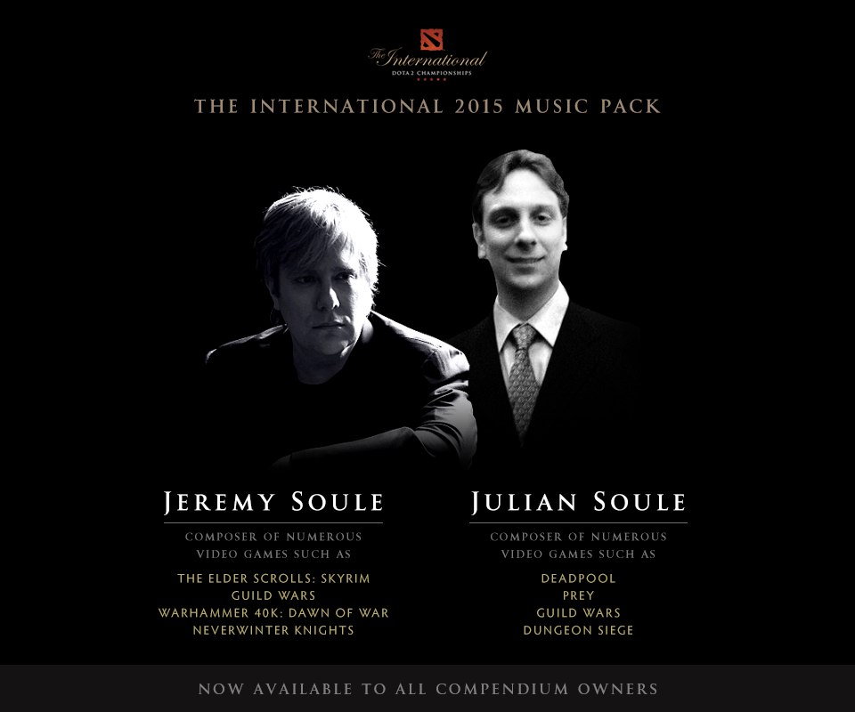 Музыкальный пак для The International 2015 был составлен композитором Jeremy Soule (автор музыки для Skyrim, Warhammer 40K и других игр) и его братом Julian Soule (автор музыки для Deadpool: Game, Guild Wars и других игр)