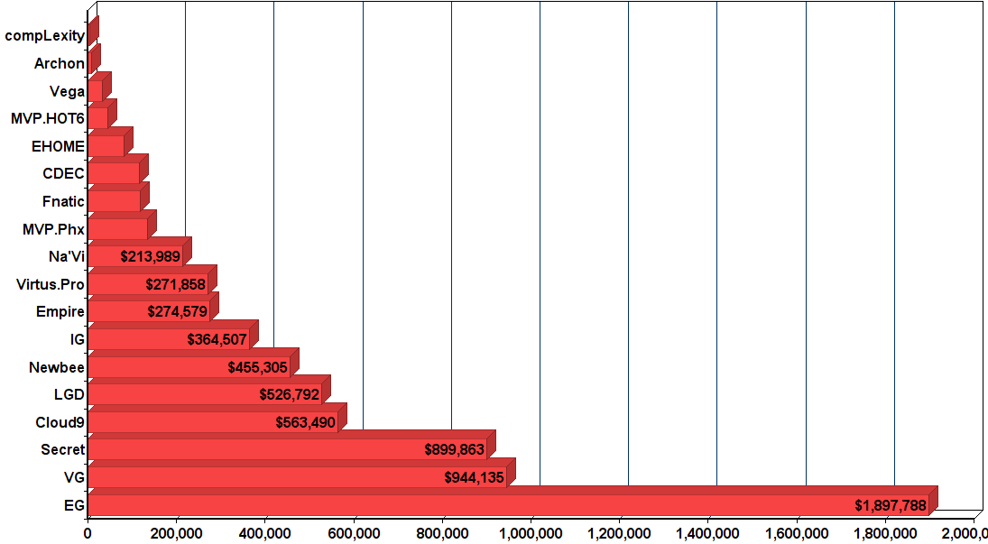 Ниже вы найдете таблицу со всеми данными, а также наглядное их (данных) представление в виде графиков. Подсчет выигранных призовых был произведен для всех команд, которые примут участие в The International 5, включая его Wild Card часть.