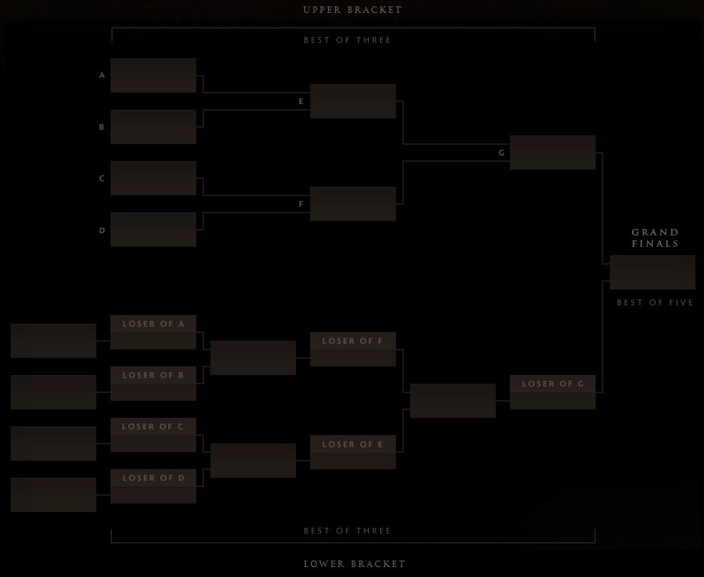 - Победители финалов верхней и нижней сеток проходят в групповую стадию, остальные команды выбывают с турнира.