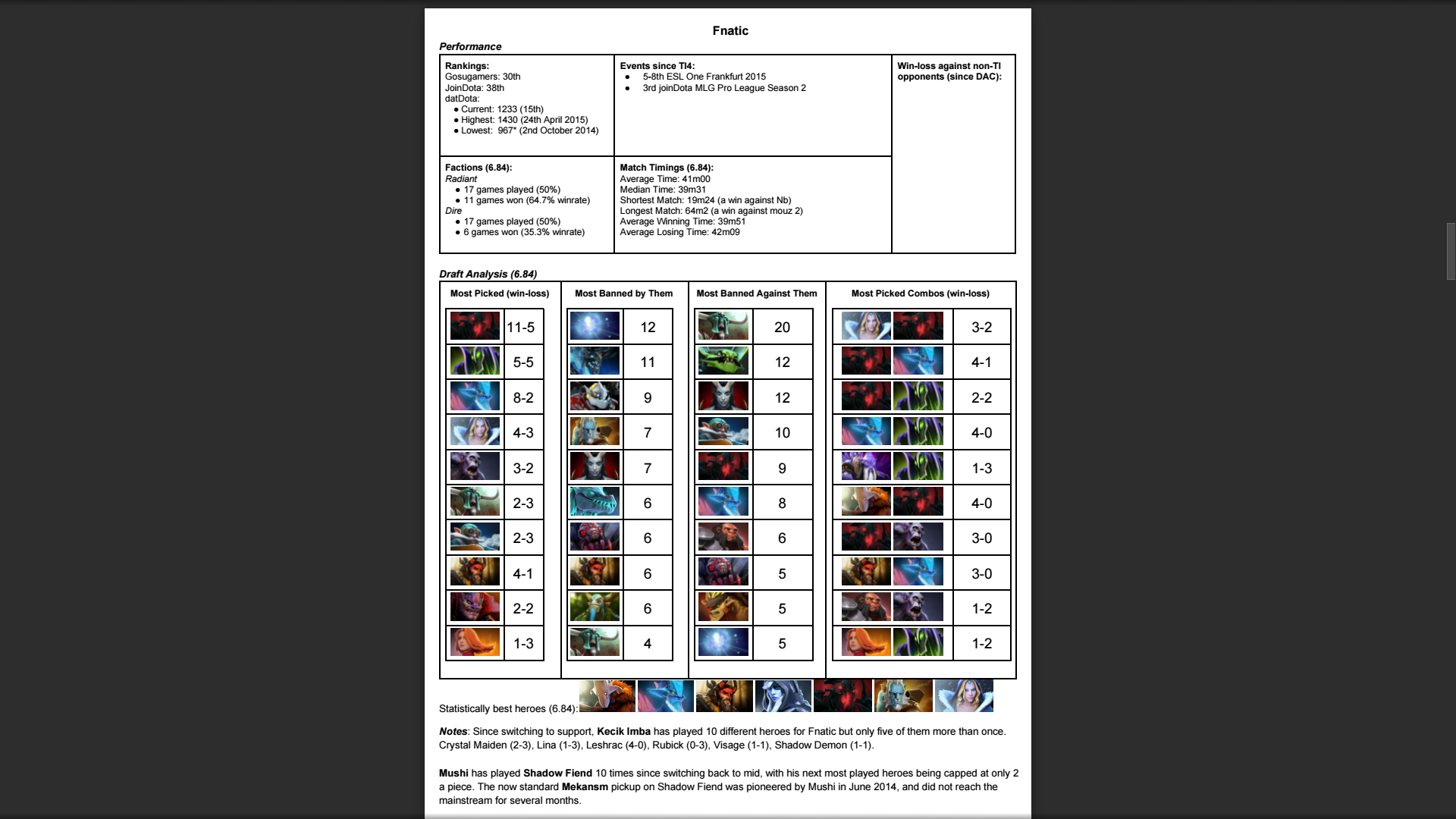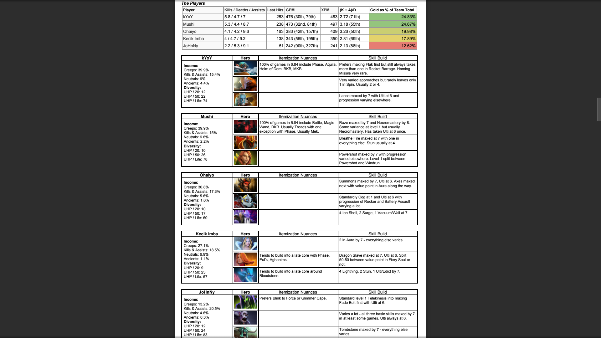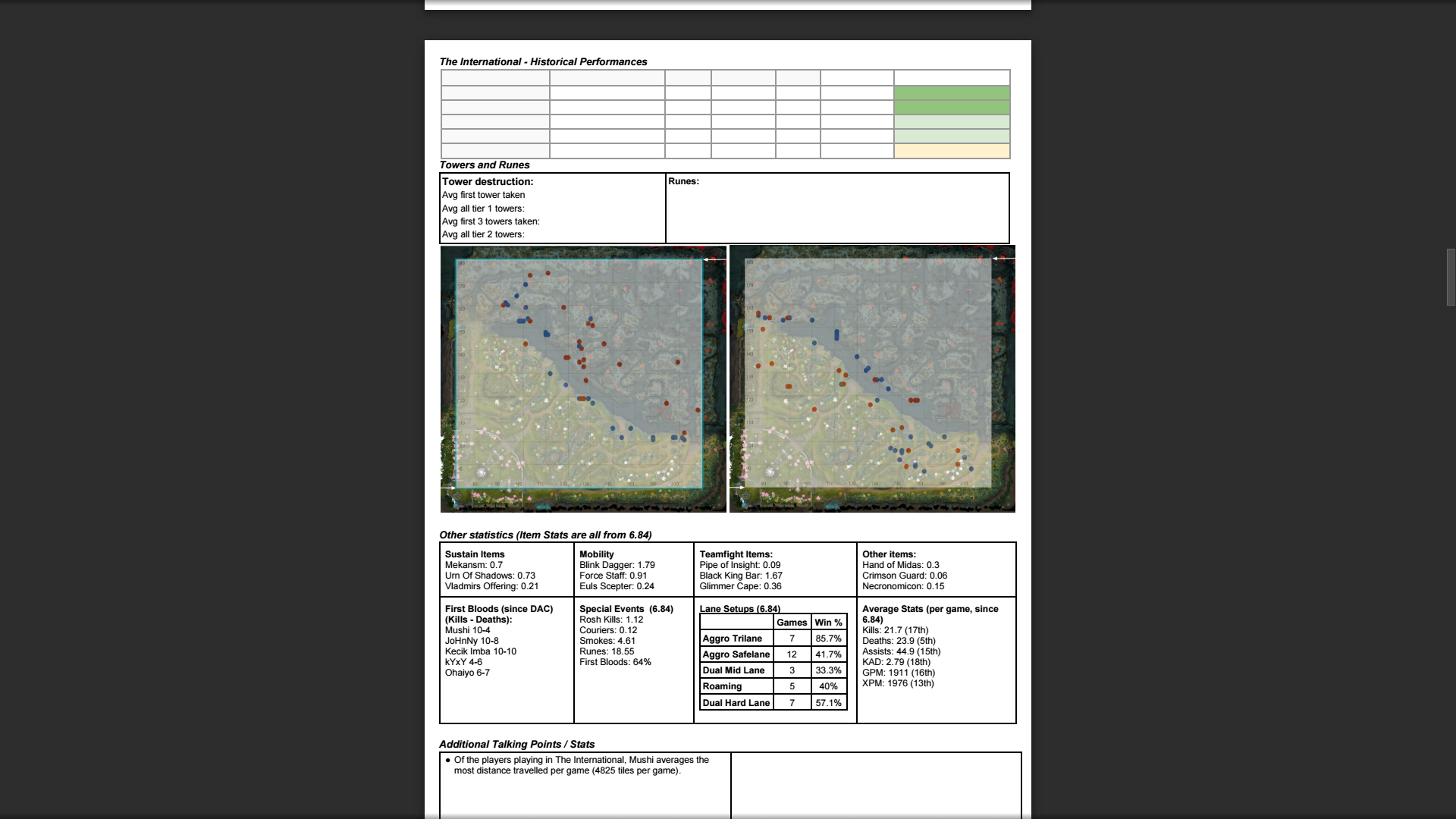 Что же такого содержится в этом «досье»? Разбор пиков/банов, нюансы в выборе предметов и прокачке героев, информация о расстановке линий и даже данные о местах постановки вардов на карте – всё это и многие другие статистические показатели по каждой команде или даже игроку в отдельности представлено в 59-страничном отчете. Более того, зачастую цифровые данные сопровождаются текстовыми пояснениями и замечаниями, которые облегчают восприятие этой информации читателю.