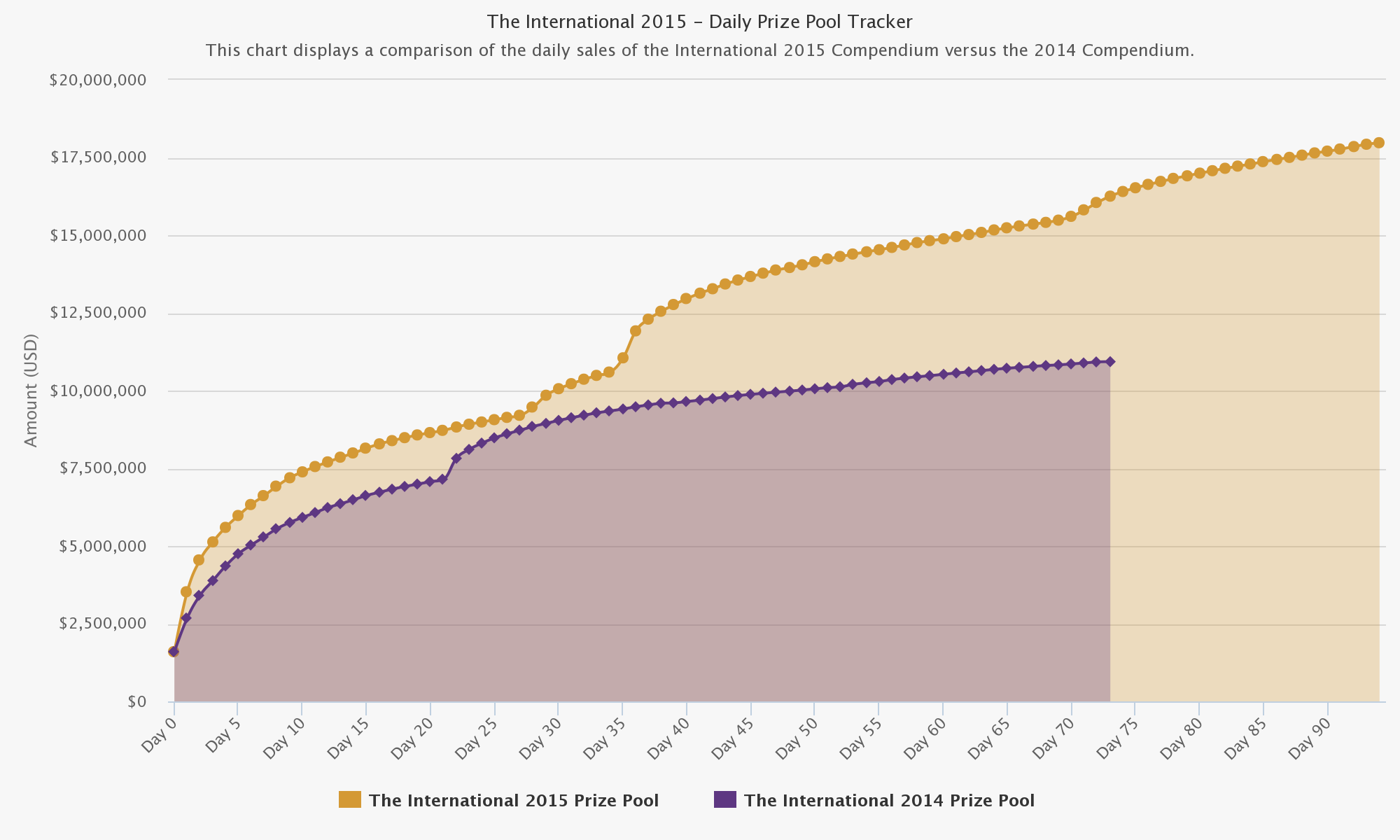 Всего лишь за несколько дней до окончания The International 5 призовой фонд турнира успел взять очередную высоту – восемнадцать миллионов долларов США! Рост призовых происходит даже несмотря на то, что все цели закончились еще на отметке в $15.000.000, а на добавление новых целей, понятное дело, рассчитывать уже не приходится.