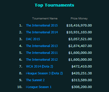 Поскольку призовой фонд The International растет с каждым годом, а двукратным чемпионом этого турнира пока не удалось стать никому, список самых богатых киберспортсменов мира претерпевает изменения из года в год. Это наглядный индикатор того, насколько большой вклад вносят турниры от Valve не только в профессиональную Dota 2 сцену, но и во всю киберспортивную индустрию. Тот факт, что подавляющее большинство сотни самых богатых профессиональных игроков планеты состоит из дотеров, наглядно иллюстрирует, насколько Dota 2 развита в денежном плане по отношению к другим дисциплинам.