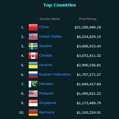 В распределении призовых по странам с большим отрывом лидирует Китай – команды из этого региона всегда занимают топовые места на международных соревнованиях, поэтому неудивительно, что китайские игроки впереди планеты всей по сумме выигранных призовых.